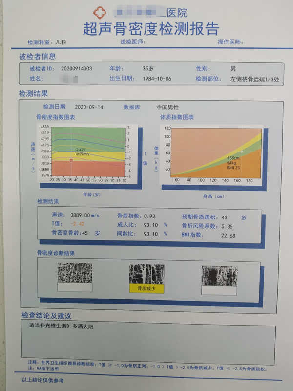 骨密度檢測能有效幫助了解骨質狀況,預防骨質疏松的發(fā)生。在臨床使用骨密度值時,由于不同的骨密度檢測儀的絕對值不同,通常使用T值判斷骨密度是否正常。T值是一個相對值,正常參考值在-1和+1之間。當T值低于-2.5時為不正常,也就是骨質疏松。