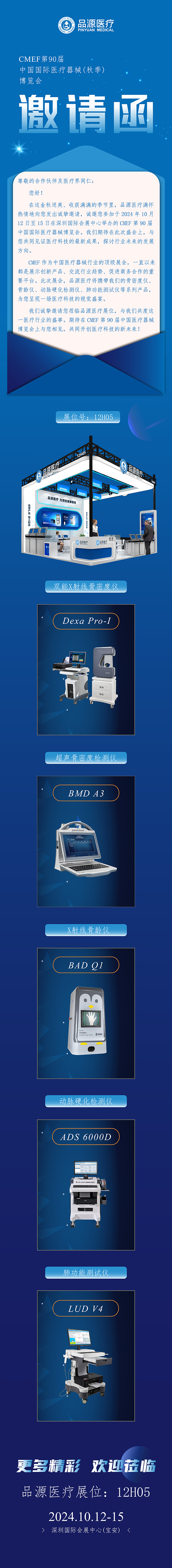 CMEF 作為中國醫(yī)療器械行業(yè)的頂級展會,一直以來都是展示創(chuàng)新產(chǎn)品、交流行業(yè)趨勢、促進(jìn)商務(wù)合作的重要平臺。此次展會,品源醫(yī)療將攜帶我們的骨密度儀、骨齡儀、動脈硬化檢測儀、肺功能測試儀等系列產(chǎn)品,為您呈現(xiàn)一場醫(yī)療科技的視覺盛宴。我們誠摯邀請您蒞臨品源醫(yī)療展位12H05,與我們共度這一醫(yī)療行業(yè)的盛事。期待在 CMEF 第 90 屆中國醫(yī)療器械博覽會上與您相見,共同開創(chuàng)醫(yī)療科技的新未來!