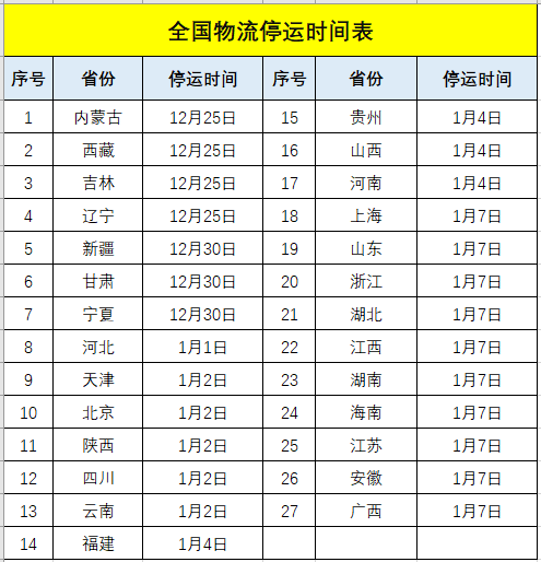 物流停運(yùn)時刻表