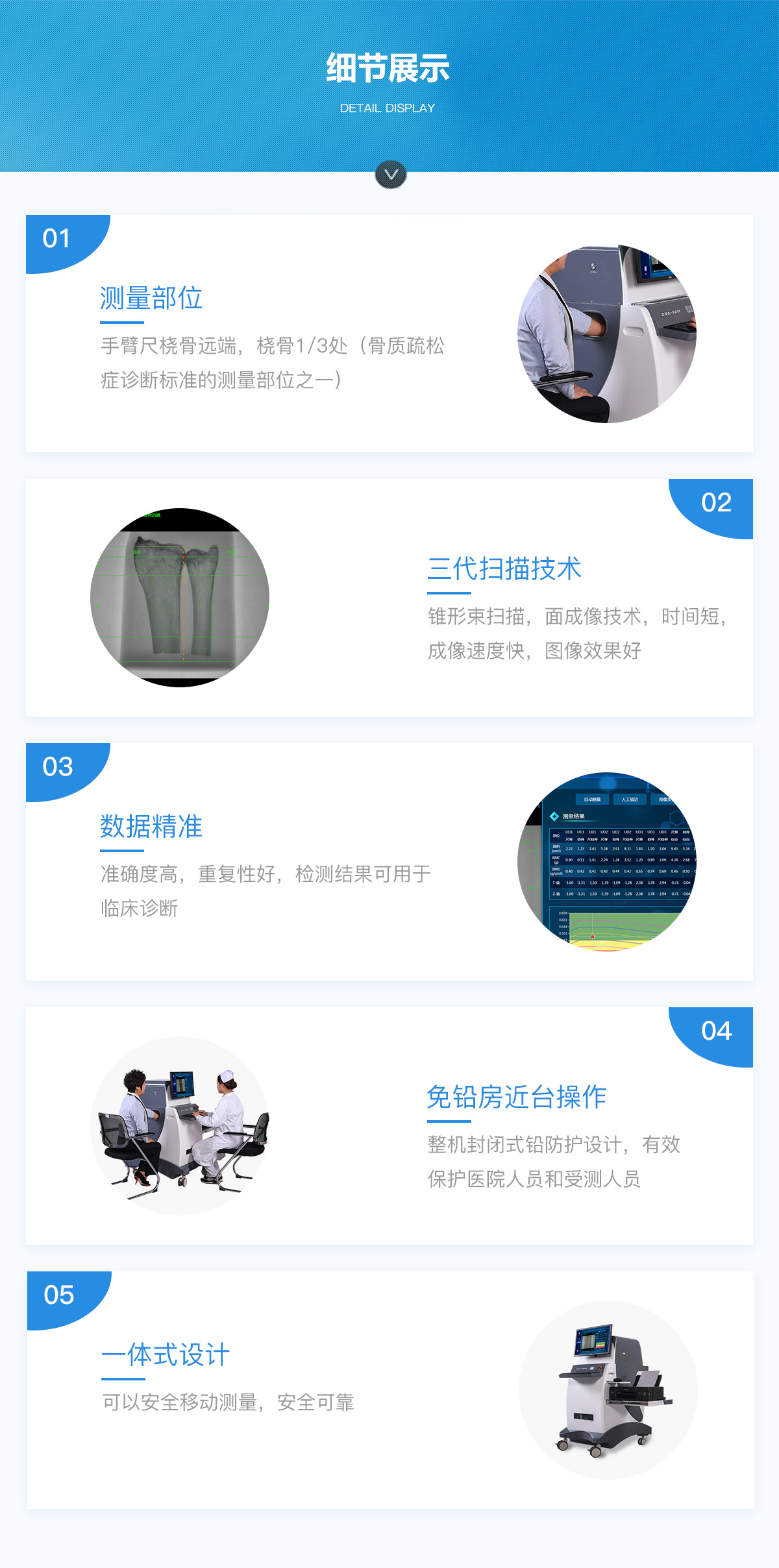 DXA- 800F 雙能X線骨密度檢測(cè)儀測(cè)量手臂前段,這些部位易顯露,操作簡(jiǎn)捷,無(wú)需消毒。測(cè)量速度快,方便醫(yī)生及病人,可用于大人群檢測(cè)。